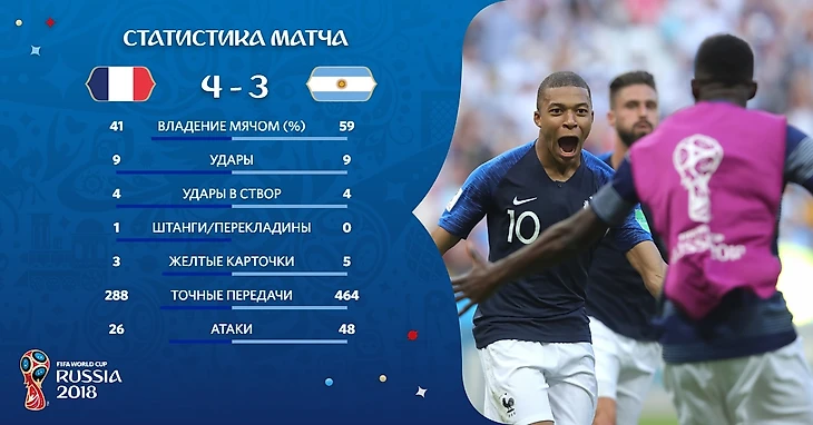 Закончился групповой турнир и началась пора игр на вылет. Этот чемпионат и так войдет в историю по зрелищности и накалу страстей, но кажется после такого он претендует стать вообще лучшим в истории. Аргентина, которая с большим везение смогла пробиться в плей-офф, в этой игре смотрелась определенным аутсайдером, и лишь мастерство Месси могло бы нас переубедить. Франция же не смотрелась во всех своих предыдущих встречах выглядела не очень зрелищно и убедительно. Но надо брать во внимание тот факт, что им всегда трудно играть против команд, которые не очень активно играют в атаке и обороняются большую часть игрового времени. Состав французов целиком и полностью пропитан ведущими игроками больших клубов. Поэтому Аргентина, имеющая много проблем как внутри коллектива, так и по тактике.