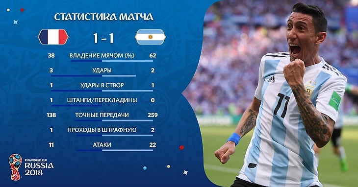 В стартовом составе южно-американцев оказался Павон, что означало, что Месси станет играть центрального нападающего в тройке и зависимость от него усилится. С самых первых минут французы очень активно начали действовать в атаке. Они с легкостью проходили центр раз за разом, проходя через провалившего турнир Маскерано. И уже на 13 минуте после подбора в центре поля Килиан Мбаппе ускорился и просто с невероятной скоростью пробежал половину поля и только фол в штрафной в исполнении Рохо смог остановить, но судья был непрекословен и с помощью VAR назначил пенальти, уверенно реализованный Антуаном Гризманом. Позже трехцветные пытались провернуть подобное еще несколько раз за игру, но все было менее эффективнее. Быстрый мяч не сильно расстроил подопечных Сампаоли и они продолжали играть, владея мячом больше противника. Даже отставание по владению и количеству передач не портило игру сборной Франции в тот день. Они грамотно заполняли все свободные зоны и грамотно действовали на подборе, отправляя быстрого Мбаппе в контратаку. Но каким идеальным не был бы механизм, всегда найдется ошибка. И на 41 минуте оставшийся  без опеки в центре Ди Мария мощно пробил по воротам Уго Льориса, сравняв тем самым счет.