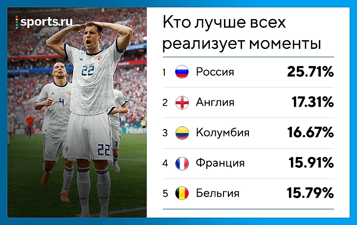 25,71% – это космическая реализация. Даже лучшие клубы планеты не показывают таких цифр. На дистанции сезона это невозможно. Но на коротких турнирах, где многое зависит от удачи, такое случается. Футбол сборных – хаотичная штука. Иногда из-за невезения хорошие команды вылетают, иногда фарт помогает скромным сборным творить чудеса. Сейчас все в пользу России. Надо наслаждаться моментом!