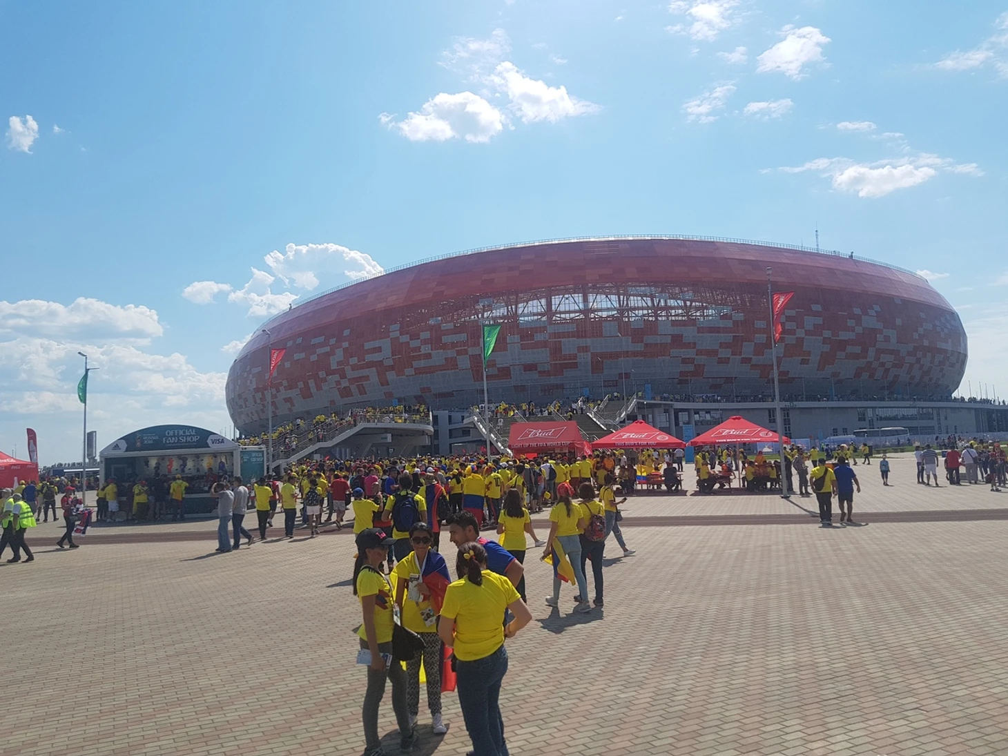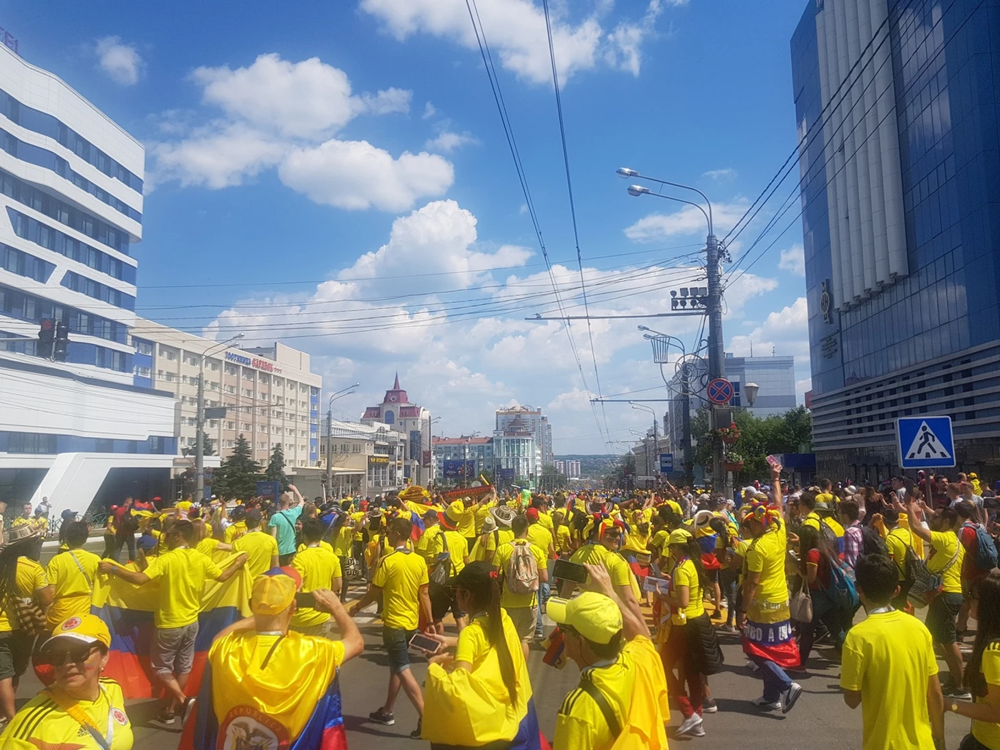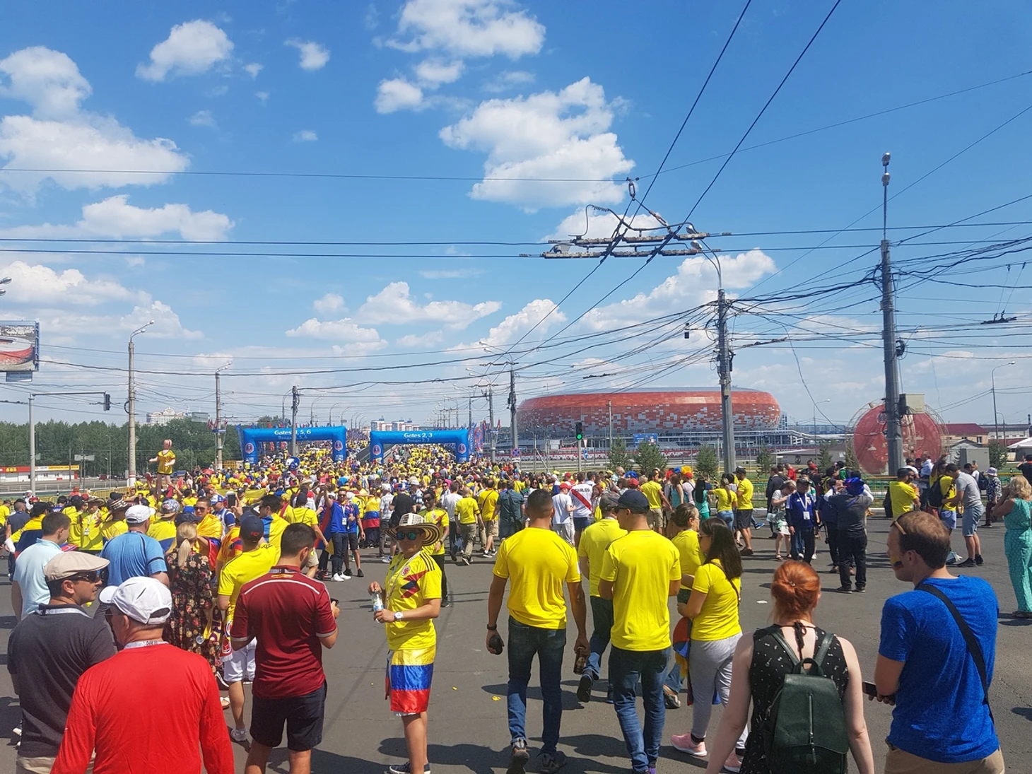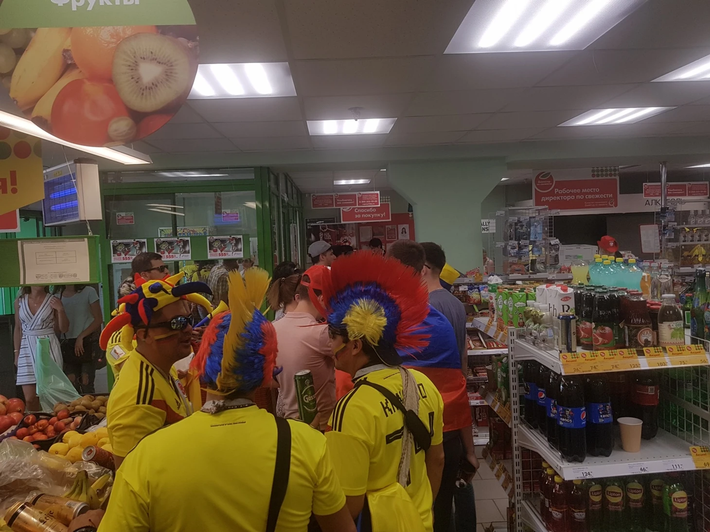 Мы выходим в город, старясь идти в тени - здесь уже достаточно жарко. Обновляя ленту спортивных новостей я узнаю что на матче ожидается 15 тысяч колумбийцев. И правда, они здесь повсюду. Покупают холодное пиво в магазинах, и собираются в большие группы чтобы устроить шествие до стадиона. Мы же направляемся в фан-зону, по недавно заведенной традиции, чтобы оценить ее уровень. Но на подходе к ней, к удивлению отмечаем ее закрытие - она начинает работать только с часа дня. при том что наш матч стартует двумя часами позже. Быстро принимаем решение присоединиться к болельщикам обеих сборных, что стоят у местной "Пятерочки".