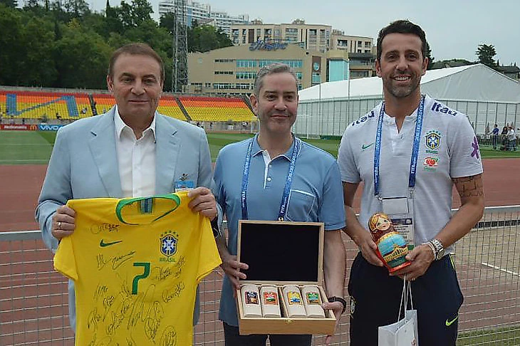 Сегодня бразильцы провели открытую тренировку на «Юге Спорт». На прощание президент конфедерации футбола Бразилии Рожерио Кабокло подарил мэру Сочи Анатолию Пахомову майку с автографами всех футболистов сборной. Пахомов в ответ подарил Кабокло матрешку и чай. «Я думаю, что для всех городов очень важно, что такие именитые команды у них базируются. Важно их мнение было услышать. Мы с удовлетворение отмечаем, что везде только very good», – сказал Пахомов.