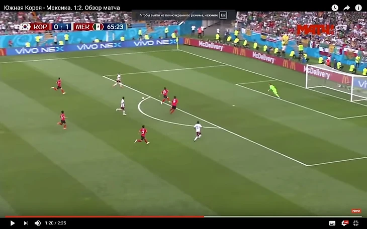 А это уже матч с Южной Кореей, где Лосано отдает голевой пас на набегающего слева от него Чичарито. Вроде бы ничего особенного, но именно таких здравых решений мексиканцам не будет хватать впоследствии в матче с бразильцами.