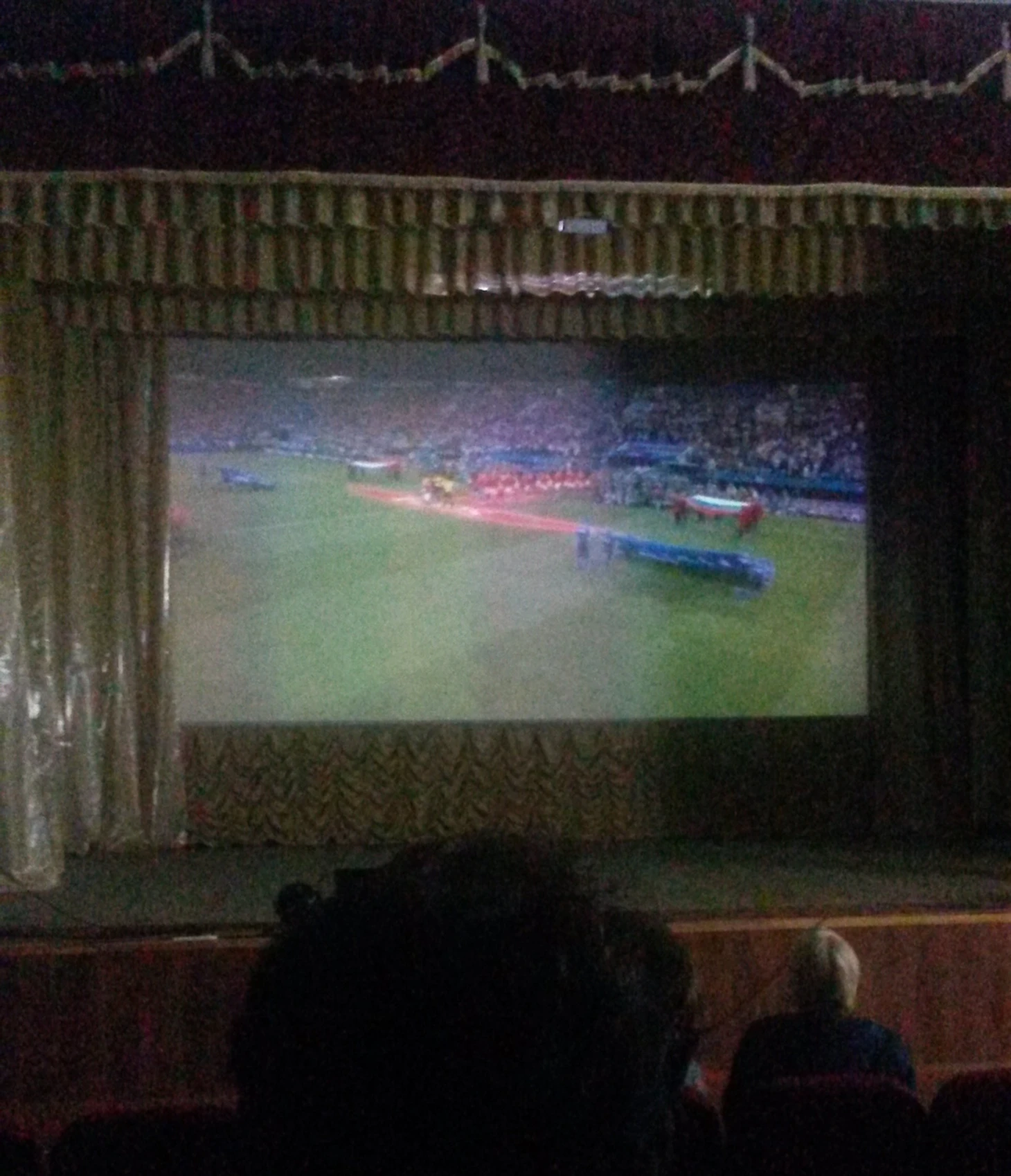 Да, всё - таки новый зал, в котором совсем недавно стали показывать фильмы. Пусть и детские, так как на взрослые в среднем собирается по 5 человек. Конечно, до сих пор неясно, зачем в этот день решили сделать платный вход, когда изначально говорилось о том, что он будет бесплатным, ну да ладно. Свободных мест было много. Большинство людей заходило парами. Возмущению людей, которые не хотели платить за трансляцию 150 рублей, не было предела. Позже этот предел вылился в общую жалобу и угрозы в сторону администрации, что сделало вдруг вход для всех желающих абсолютно бесплатным. Вот тут то и начался сам футбол.