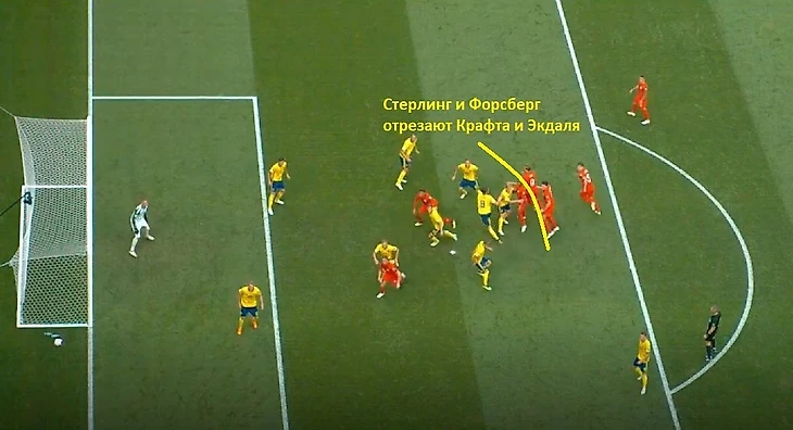 Изначально расстановка с тремя центральными защитниками была придумана, чтобы получить численное преимущество против пары форвардов соперника. Помимо этого, у 3-5-2 есть еще и превосходство в центре поля – 3v2, а паре своих форвардов противостоят два защитника (преимущества нет). В позиционной обороне вингбэки держат вингеров и при необходимости могут выдвинуться на крайних защитников, а при их подключении лишний игрок из центра поля может сместиться к флангу и не допустить ситуации 1v2 – идеальный план против перегрузов. Учитывая эти детали, можно сказать, что сборная Швеции вышла на игру, уже проигрывая сопернику.