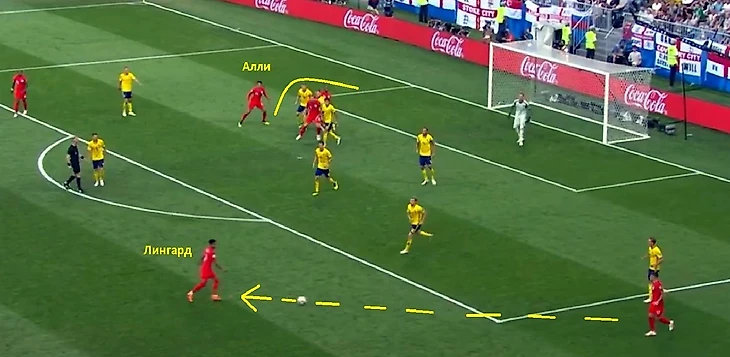 Янг принимает мяч, разрыв между линиями слишком велик. Мяч транзитом через Алли доходит до Лингарда, отскок после его удара подхватывает Триппьер. Алли после паса на Джесси подключается под заброс, как это часто происходит в «Тоттенхэме»