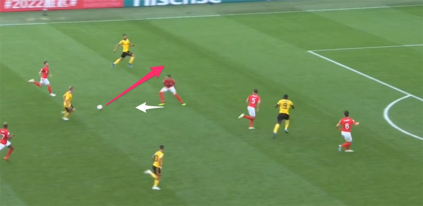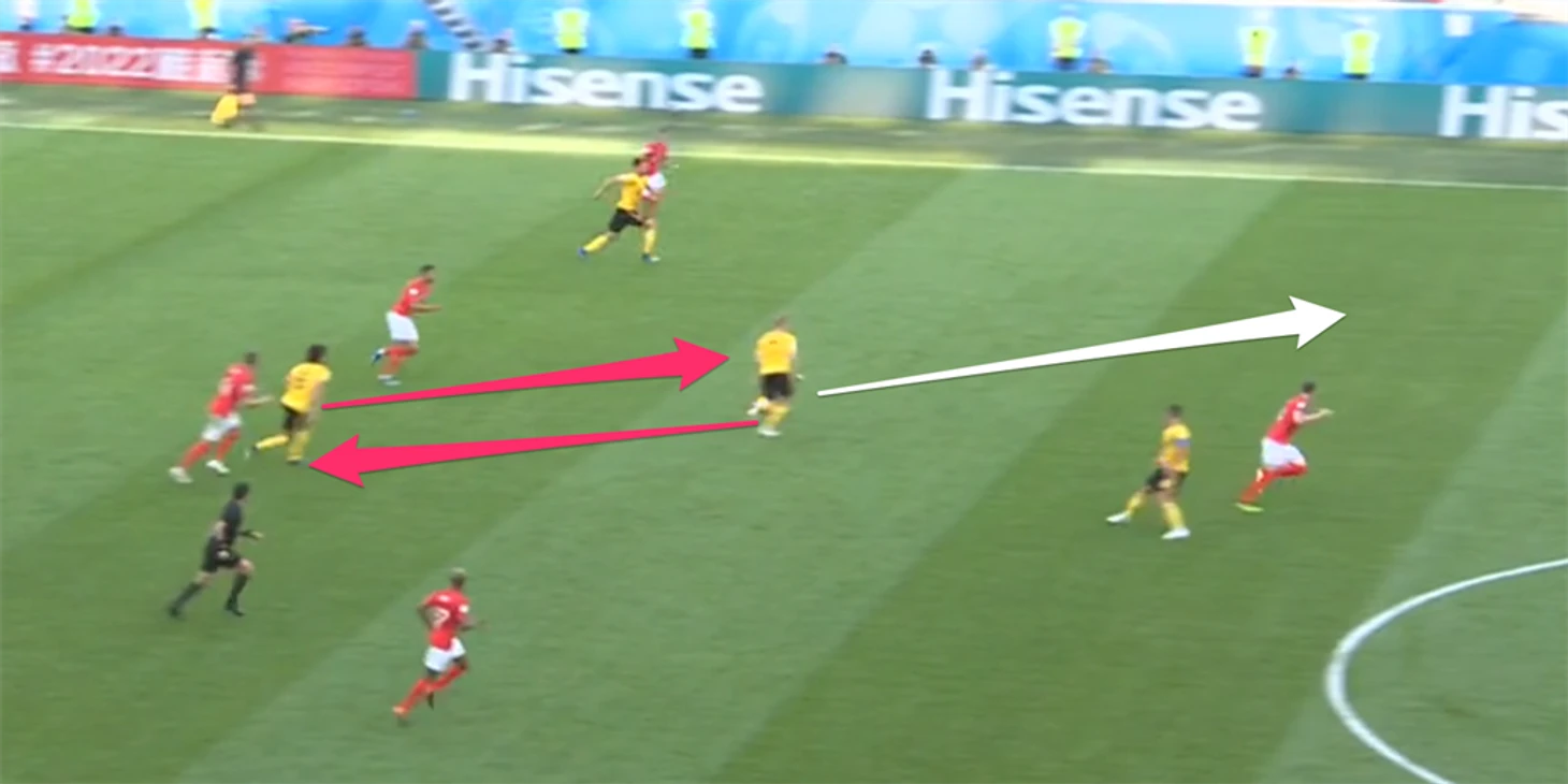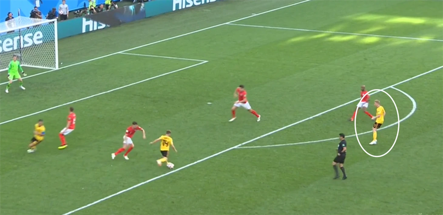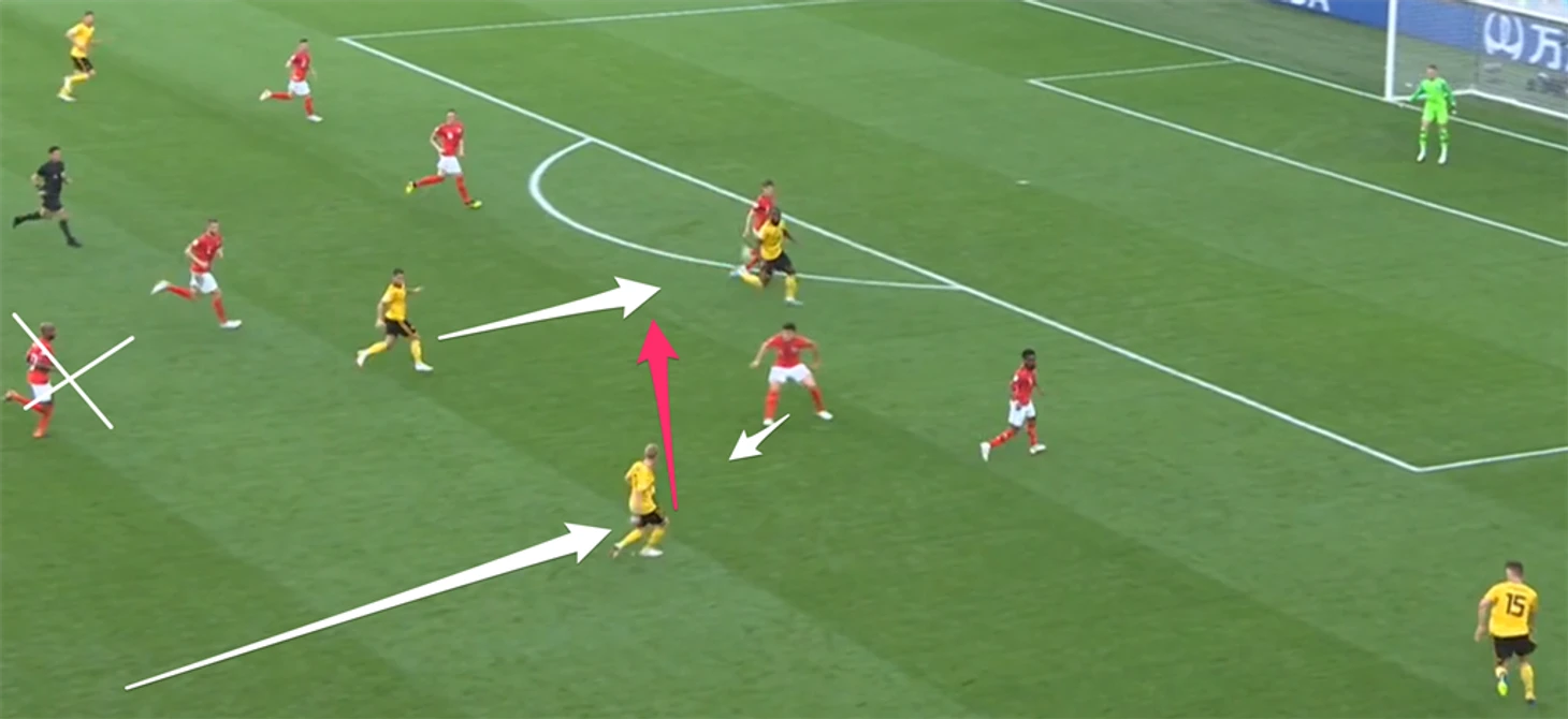 Еще один урок по теме разгона контратак от седьмого номера сборной Бельгии. Сначала, Кевин снова получил мяч в центре поля. Качнув Дайера, он отдал передачу на ход Менье. Идеальную передачу на ход Менье