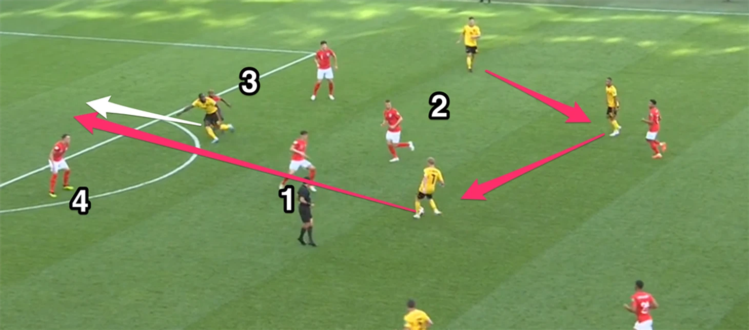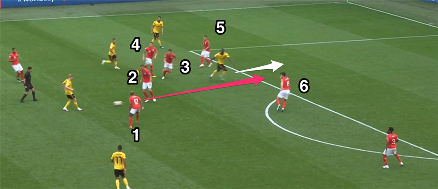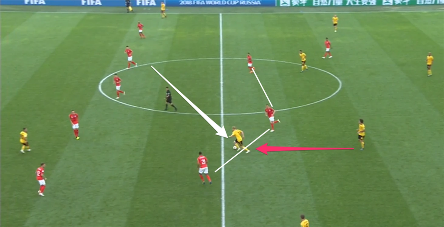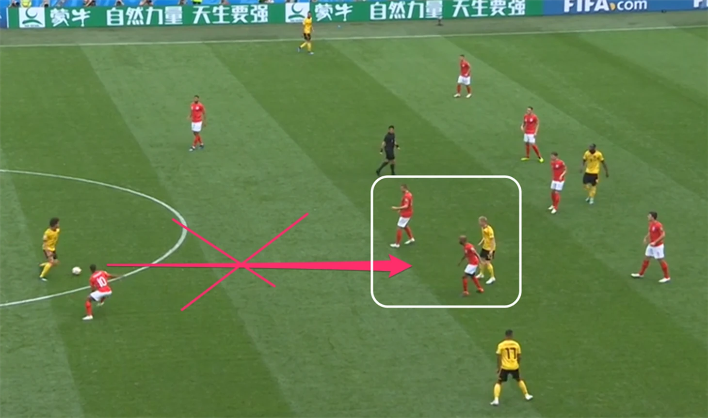 Еще один урок по теме разгона контратак от седьмого номера сборной Бельгии. Сначала, Кевин снова получил мяч в центре поля. Качнув Дайера, он отдал передачу на ход Менье. Идеальную передачу на ход Менье