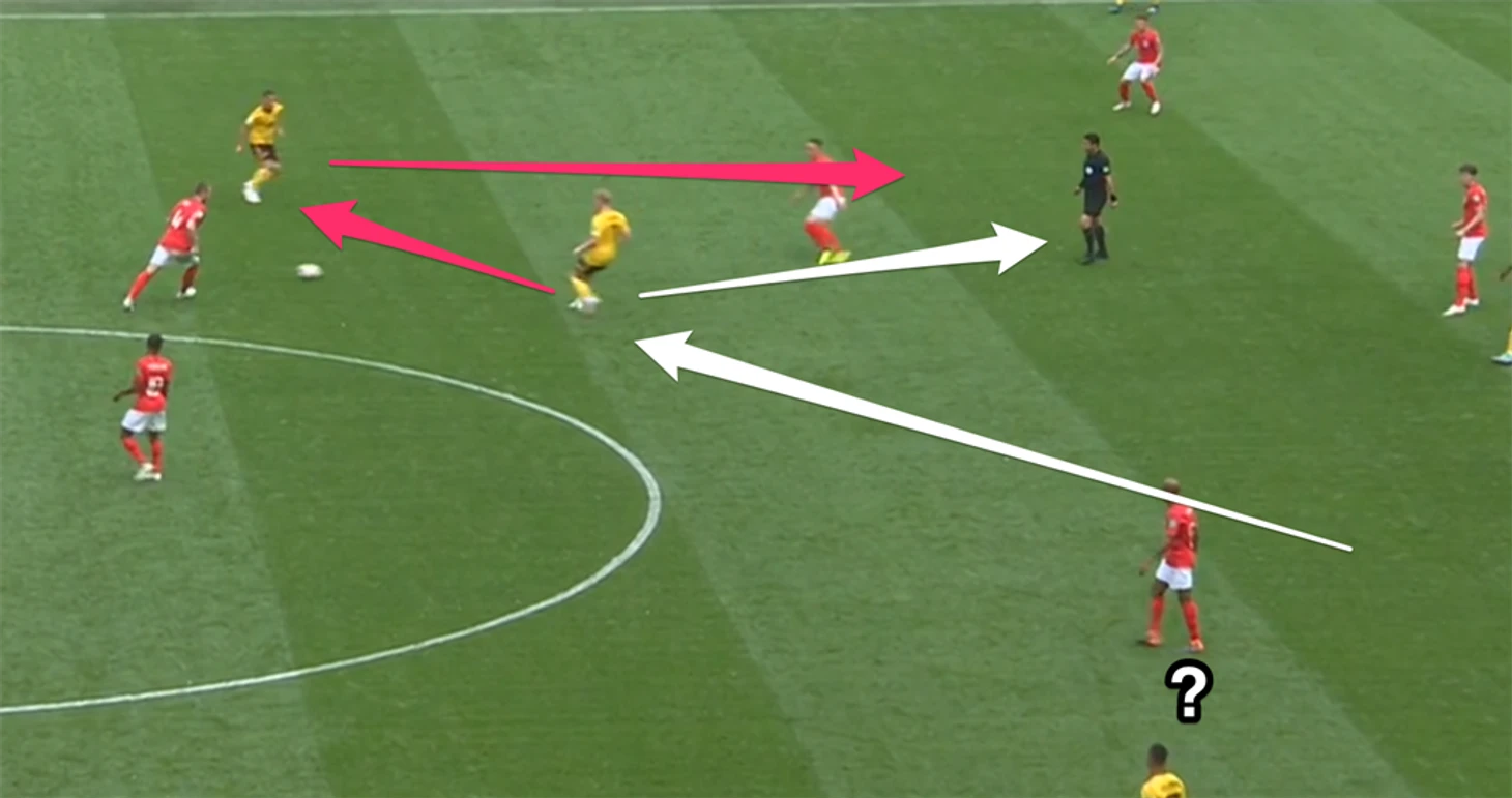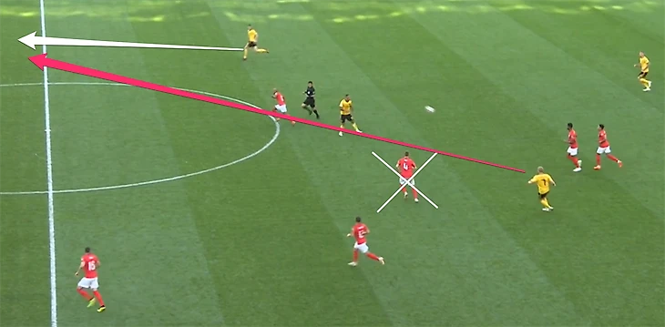 Здесь снова на первое место вышла разница между игрой Франции и Англии. В полуфинале в таких моментах тройка нападающих уничтожила бы Тилеманса и у Де Брейне никогда бы не появилось столько места. Здесь же, Делф, номинально играющий по Де Брейне, пошел встречать Тилеманса и поставил Кевину пол поля для маневров