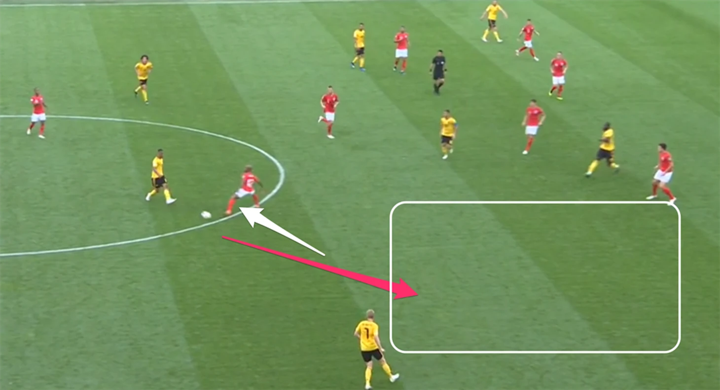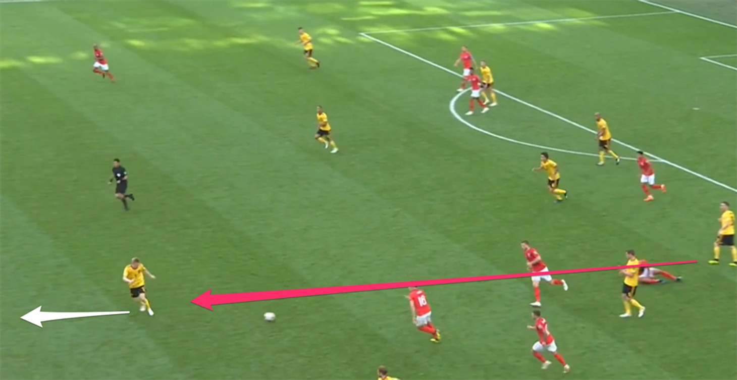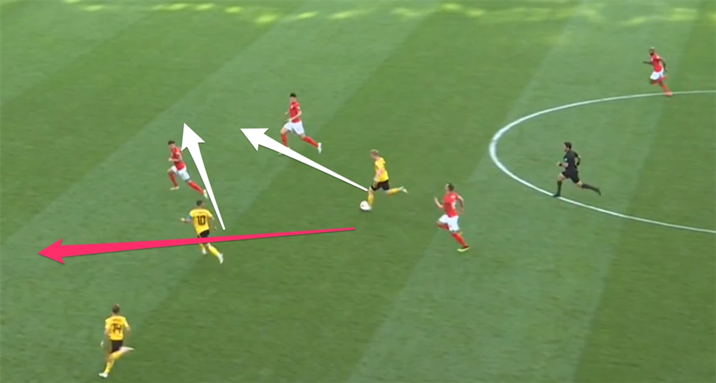 Предварительно обыгравшись с Витцелем, Кевин оказался на свободном пространстве вблизи своих ворот и, не стесняясь, протянул мячик через все поле
