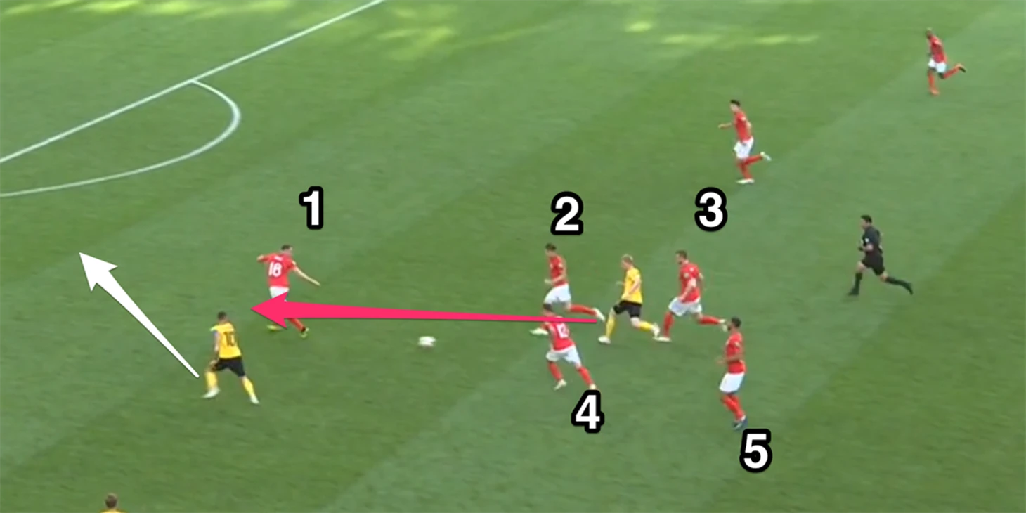 В очередной раз, во время позиционной атаки своей команды Де Брейне ушел со своей позиции номинально правого нападающего, получив мяч между линиями. Снова таки, Витцеля никто не встретил, а полузащитники опять проморгали врыв Де Брейне. Большой им привет
