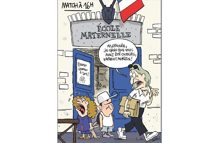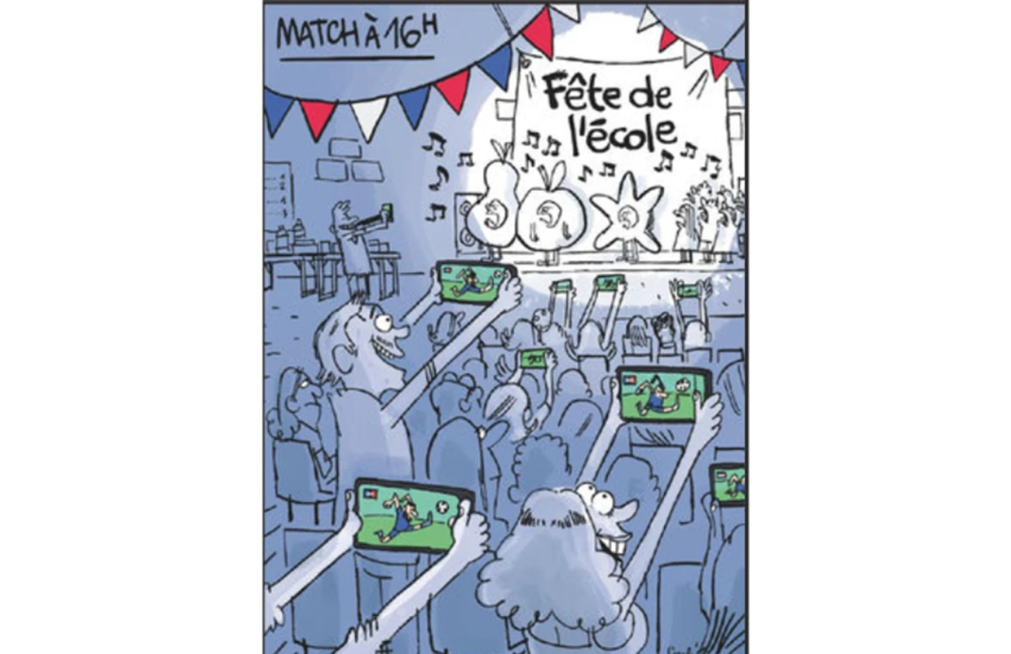 6 июня. Матч 1/4 финала Франция-Уругвай начинается в тот час, когда детей принято забирать из детских садов и начальных школ. Объявление на двери: «Всем хороших каникул!» Убегающая училка оставшимся деткам: «Очень жаль. Думаю, о вас уже забыли, Карим и Адриан».