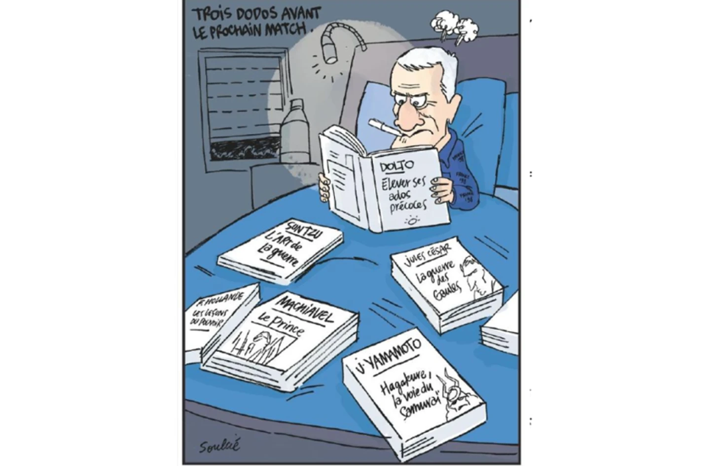 18 июня. Дидье Дешам (на стене «до следующего матча спатеньки осталось три раза») должен внести коррективы перед вторым матчем. В его руках книга «Воспитать своего вундеркинда». Вокруг другие: Сунь Цзы «Искусство войны», Юлий Цезарь «Галльская война», Ямамото «Хагакурэ, путь самурая», Макьявелли «Государь», Ф. Олланд «Уроки власти».