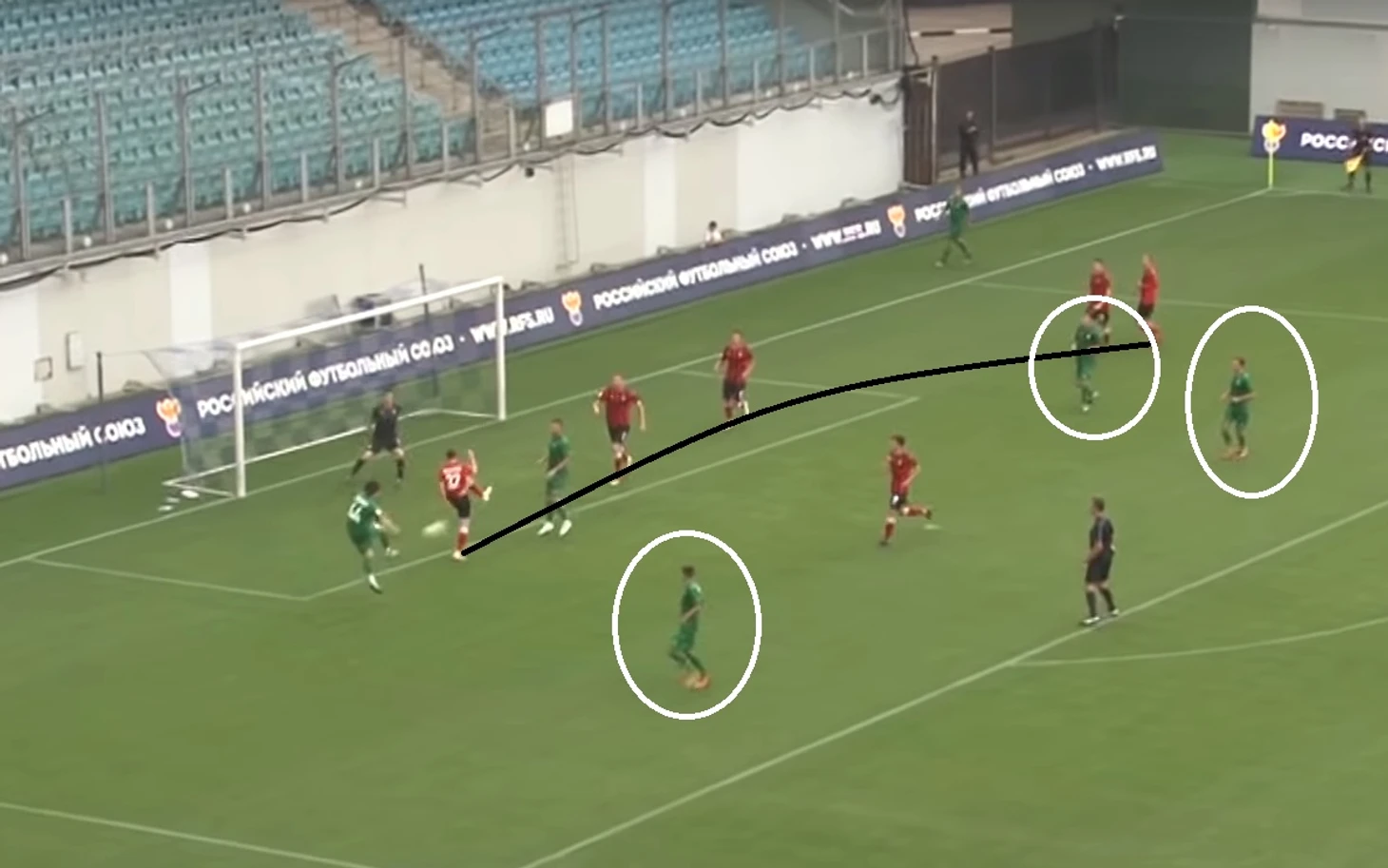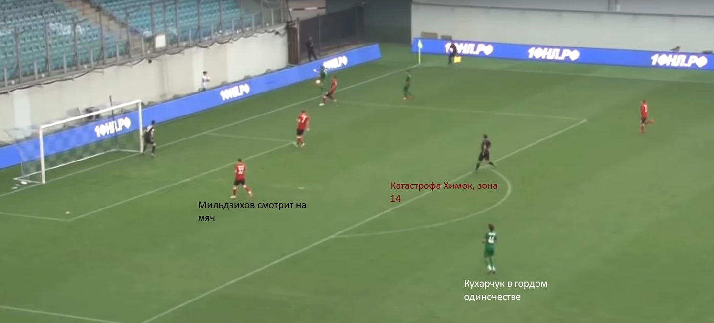 Вот о чём я говорил про провалы фланга Кухарчук - Зуйков. Весь эпизод они вытянувшись в линию по направлению к воротам смотрели на мяч и не видели, что там у них за спиной. Очень жаль, что бьющий игрок не прочувствовал момент и не покатил на право - отрезал бы почти всех.