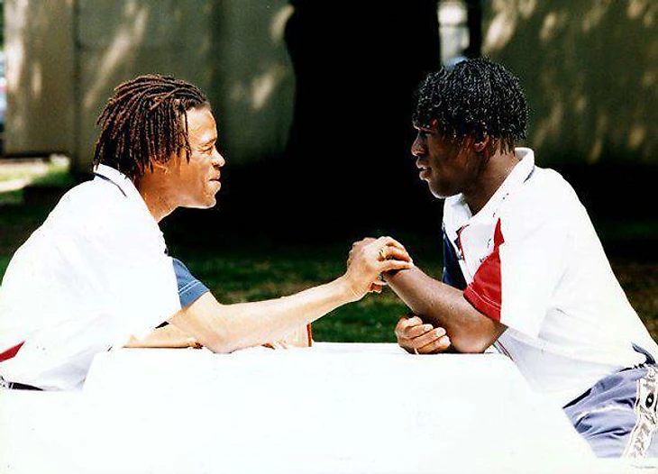 Эдгар Давидс с Кларенсом Зеедорфом на Чемпионате Европы, до того как был исключен из турнира за осорбление Гуса Хиддинка, 1996.