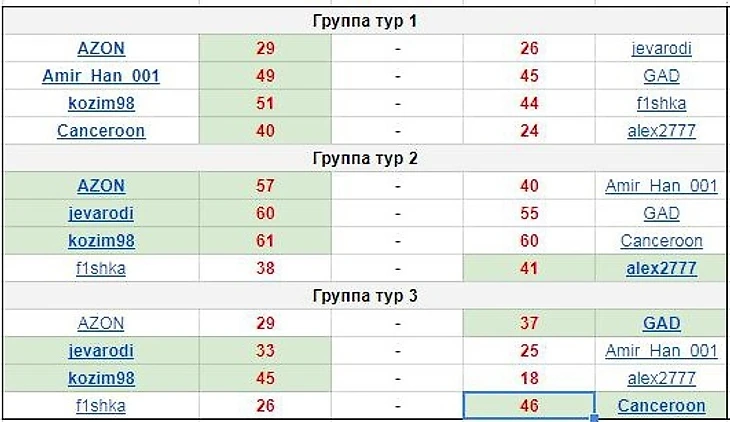 После каждого матча, по возможности, я проставлял набранные игроками ФО, таким образом участники фактически онлайн видели изменения, происходящие в турнире. Появлялся повод радоваться и наоборот