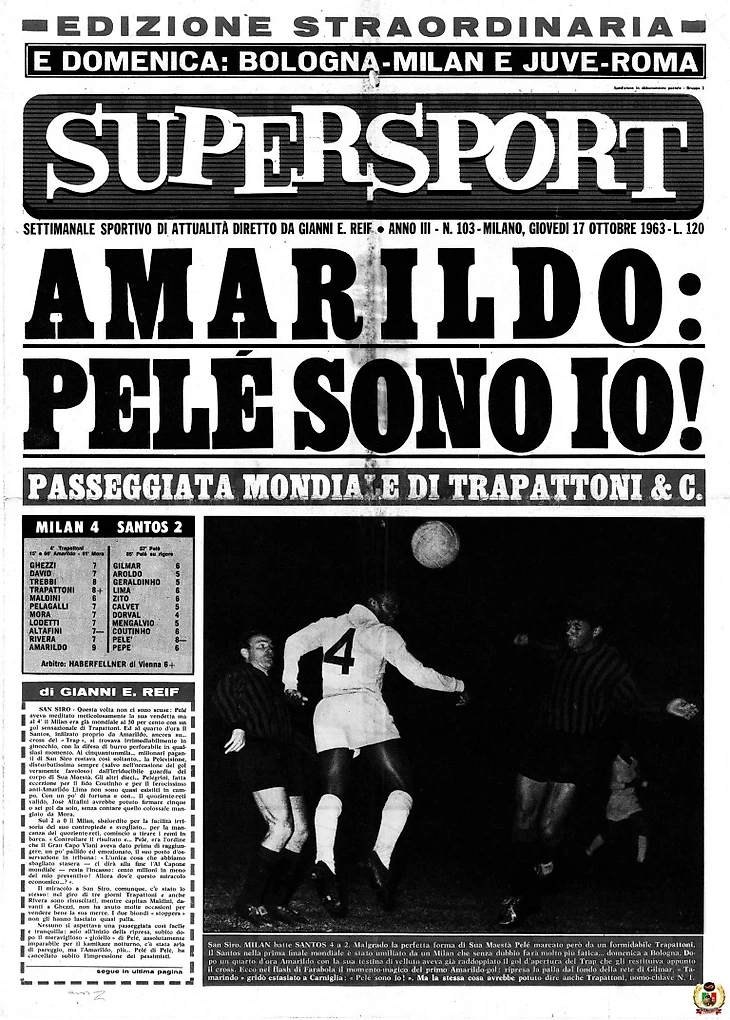 …Грандиозное представление удалось на славу ! Шесть голов и победа «Милана». Но… Король забил дважды во втором тайме, потому и Король мяча . Сначала не справился Трап , а за пять минут до окончания «Ночи миллионеров» Пеле реализовал пенальти , переиграв Гецци. Сенсационная красивая победа привела прессу в состояние близкое к экстазу. 4:2 в пользу чемпионов Европы ! В отчётах о матче писали ни «Ривера» , а «Риверино», заголовки «Ад для Пеле» , «Дьявол-Амарилдо уничтожил Сантос» никого не смущали, бурные эмоции захватили всех ! Подопечные Дона Луиса Карнильи получили заслуженную похвалу от спортивных обозревателей, Италия ликовала. С нетерпением ждала ноябрьского поединка в Бразилии на "Маракане"…