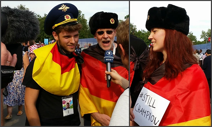 Другую группу немецких болельщиков мы встретили у самого стадиона – они давали интервью немецкому телеканалу. Из того, что удалось подслушать, самое примечательное – ребята изначально купили билеты только на финал, так как не сомневались, что Германия будет играть этот матч. Мол, билеты очень дорогие, зачем попутно тратиться на всякую ерунду (типа полуфинала, видимо). Рачительные немцы сразу после позорного вылета хотели свои билеты сдать, но наслушавшись знакомых, вернувшихся с мундиаля, решили все-таки съездить, посмотреть на wunderschönes Russland своими глазами. Надеюсь, не пожалели.