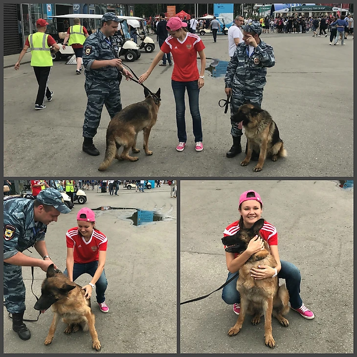 Тем не менее, атмосфера праздника… как бы это сказать… буквально висела в воздухе )) Волонтеры старались изо всех сил. То ли предчувствуя близкий конец их безвозмездных мучений (многие и правда очень устали за время чемпионата), то ли осознавая важность момента. Улыбались, махали поролоновыми пальцами, развлекали во время досмотра в проходных павильонах. В порядке была даже милиция. Мне не просто дали потискать собаку, а еще и пытались уговорить ее принять подобающую позу для совместного фото. И собаке, и товарищам в форме – зачет, уважуха и всяческая симпатия.