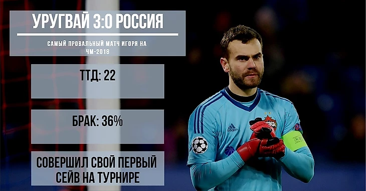Заключительный матч в группе против Уругвая вряд ли кто-то из нашей сборной может занести себе в актив. Акинфеев пропустил целых три мяча, несмотря на то, что совершил свой первый сейв на турнире, сохранив ворота неприкосновенными после выхода один на один с уругвайским футболистом.