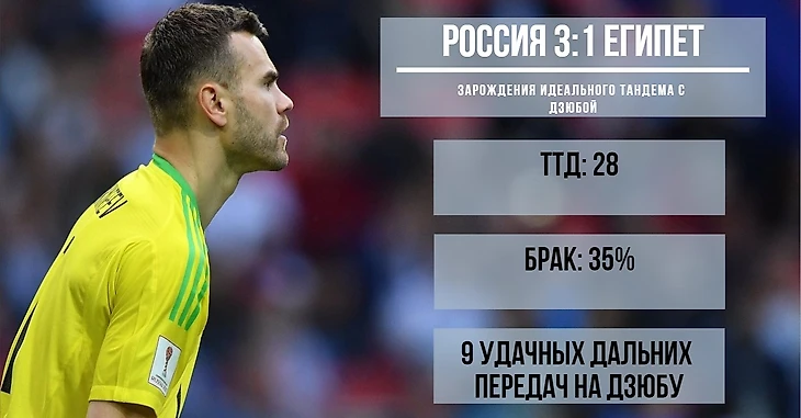 Зарождение этого эффективного тандема произошло именно в матче против Египта, когда армейский воротчик выдал 15 дальних передач, из которых лишь 6 оказались неудачными. Большинство выносов Акинфеева принимал на себя Дзюба, выигрывая одно верховое единоборство за другим.