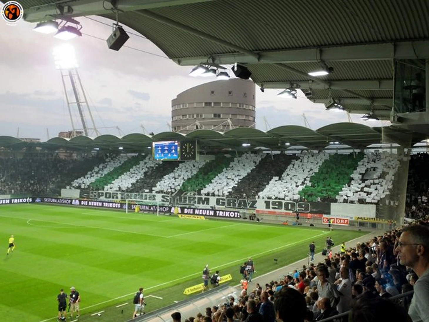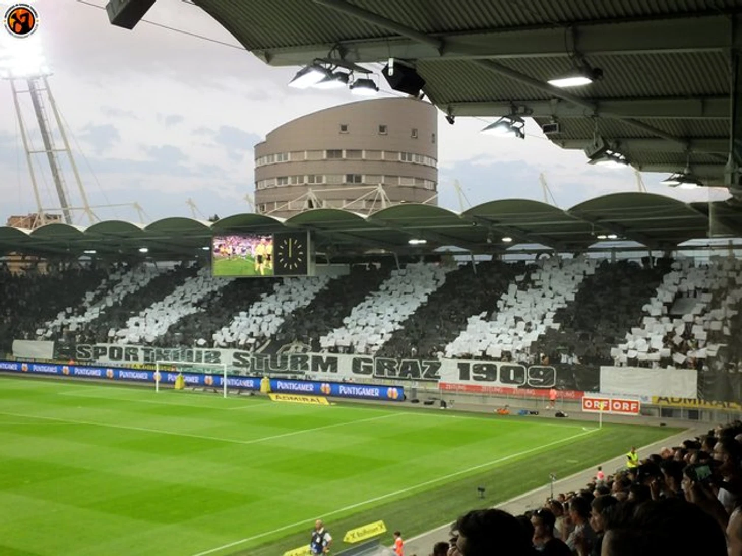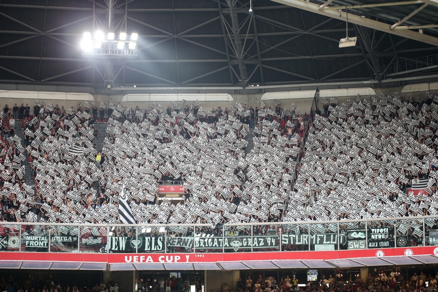 На стадионе же фанаты из Граца сделали довольно простой по исполнению, но очень эффектный визуально перфоманс с тысячей одинаковых флажков: