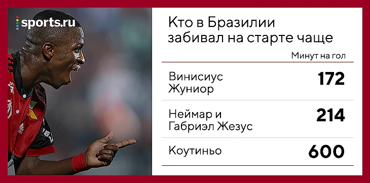 Пока Винисиус на верном пути. Журналисты Globo подсчитали, что он начал мощнее Неймара, Коутиньо и Габриэла Жезуса. Винисиус забил 8 голов за первые 1380 минут, в то время как Неймар и Жезус – по 7 за 1500, а Коутиньо – 5 за 3000.