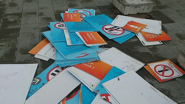 Всё бы ничего, но позавчера увидел новость, что временные конструкции (тьфу-тьфу, не трибуны с дешёвыми билетами) начали разбирать. С опозданием, но начали. Вот эти вот шатры с табличками в едином дизайне, досмотровые группы на въездах и тому подобные вещи, перекрывающие несколько здравых проездов. И вот вчера по случайности довелось пройти мимо стадиона, и я увидел вещь столь невиданную и возмутительную, столь редкую для наших отполированных для блеска городов - мусор. Мусор, в основном состоящий из тех самых табличек в едином дизайне, был тупо брошен на тротуар и, подхваченный вчерашним штормовым предупреждением, благополучно отправился гулять по окрестностям.