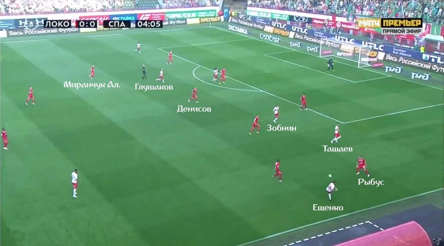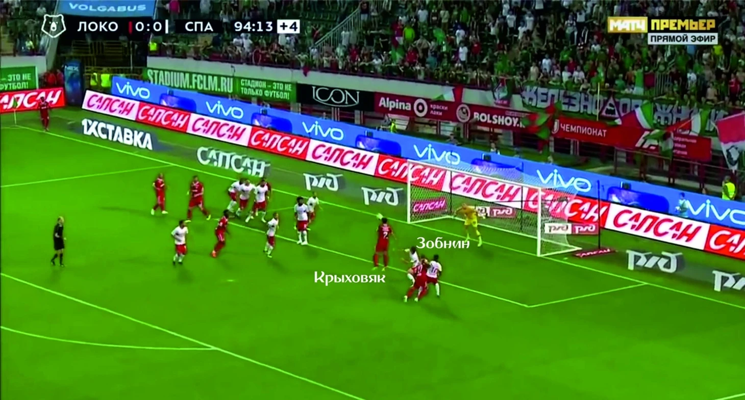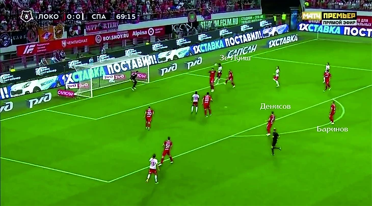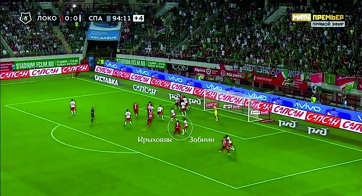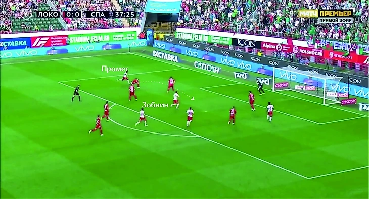 Денисов бросил все силы на просмотр игры Промеса, Крыховяк, наверное, уже бежит и жалеет, что перебрался в «Локомотив» и его обречённости не видно конца, так что за Зобниным он не побежал. В итоге пас на свободного Зобнина, и только недостаток мастерства «спартаковцев» не позволяет им открыть счёт.