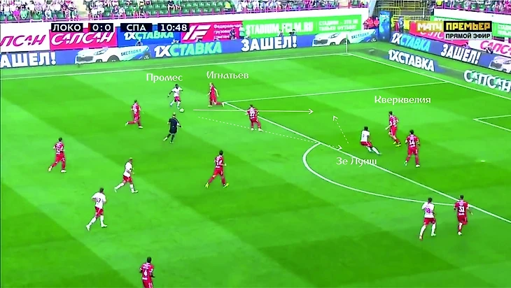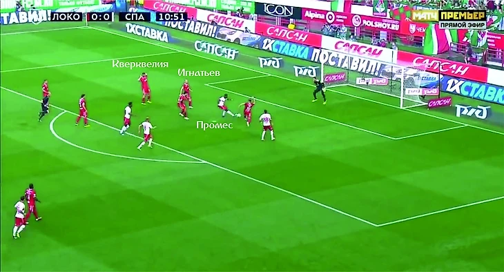 Начинается с того, что Игнатьев неуклюже сопровождает Промеса. «Спартаковец» смещается вправо, что сразу выводит Игнатьева из борьбы. Тем временем, медлительный Кверквелия неспособен плотно играть с подвижным Зе Луишем, из-за чего два «спартаковца» в пару касаний обыгрывают всю оборону «Локомотива».