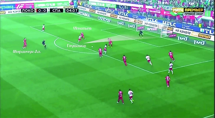 Зобнин пропускает мяч. Зе Луиш тоже пропускает мяч, и Глушаков выходит на ударную позицию прямо по центру ворот совершенно без помех. Провал игроков «Локомотива» следующий. Игнатьев вынужденно сместился к Глушакову, но бросил Промеса, которому, будь Глушаков умнее, можно было отдать пас с выходом один-на-один.