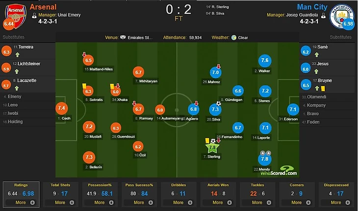 Очевидно, и Эмери это много раз подчеркивал, что "Арсенал" вышел играть в атакующий футбол с использованием высокого прессинга. Под это дело в опорную зону Эмери выставил Джаку и Гендузи, которые должны были сдерживать центральных хавбеков "Ман Сити" и двигать мяч в финальную треть поля,а двужильный Рэмси своим движением мог бы вносить хаос в опорную зону противника в котором Мхитарян и Озил создавали бы шансы для Обамеянга, но это все в теории.