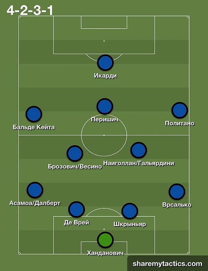 При схеме 4-2-3-1 более агрессивный и атакующий рисунок игры. Дирижировать будет атакующий полузащитник. Эту позицию могут занять Иван Перишич, Жоао Марио и Лаутаро Мартинес. У Жоао откровенно говоря не получается в Интере и складывается впечатление, что его пик был на Евро 2016, он просто увяз в стагнации. Мартинес же будет более продуктивен в качестве форварда. Также эту позицию может занять Иван Перишич и в таком случае Интер сможет играть более креативно и качественно.