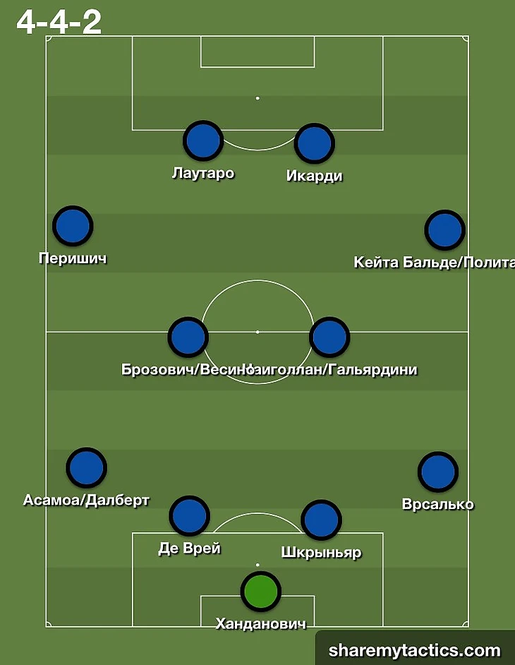 Схема 4-4-2 с двумя вингерами. Здесь всё будет держаться на паре центральных полузащитников – Брозович/Весино- Наингголан. Это будет намного ярче, ведь Наингголан и Брозович- большие мастера создать опасный момент, да и пройти их очень нелегко. Связка в нападении Икарди-Лаутаро создаёт новые опции для Спаллетти в атаке.