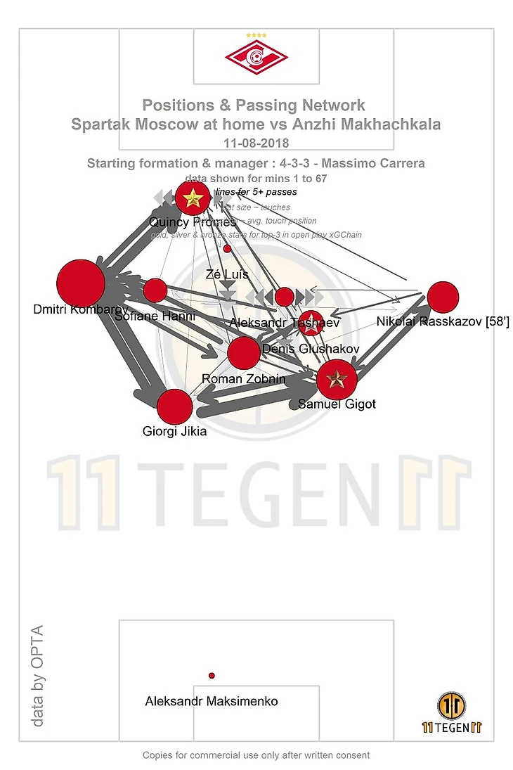 Спартак очень часто играет назад и в основном это происходит через Комбарова.