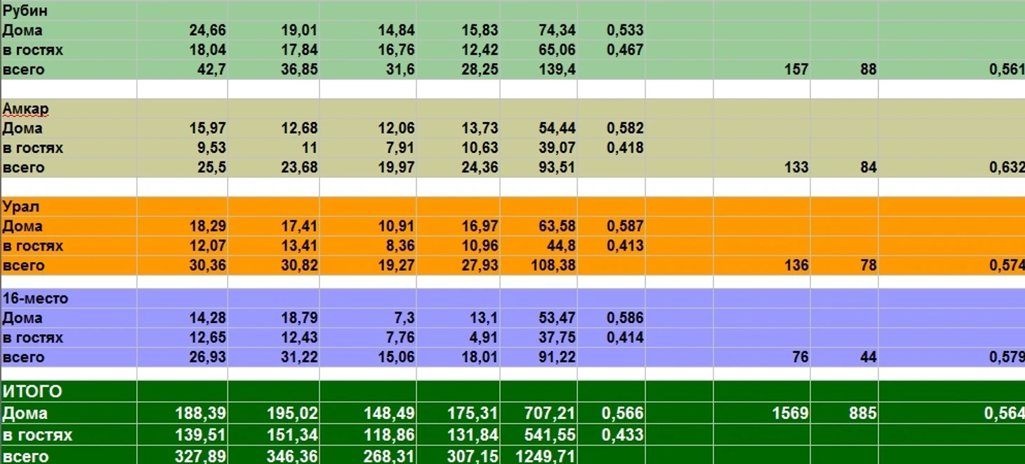 Итак, мы видим, что в среднем, Команды набирают в домашних матчах 56,4% от общего количества очков. При этом нет серьезных различий между топ-клубами , середняками и аутсайдерами. Единственное серьезное отклонение, которое я обнаружил, пока делал эту таблицу- это то, что последние 2 сезона СКА-Хабаровск и Томь дома набрали существенно больше очков, чем на выезде. Связываю это прежде всего с географией и сменой часовых поясов. С одной стороны акклиматизация в Томске и, особенно, в Хабаровске может серьезно влиять на конечный результат матчей, проводимых там, с другой стороны, наоборот, постоянная смена часовых поясов, когда Томь и СКА играли на выезде также шла им в минус.
