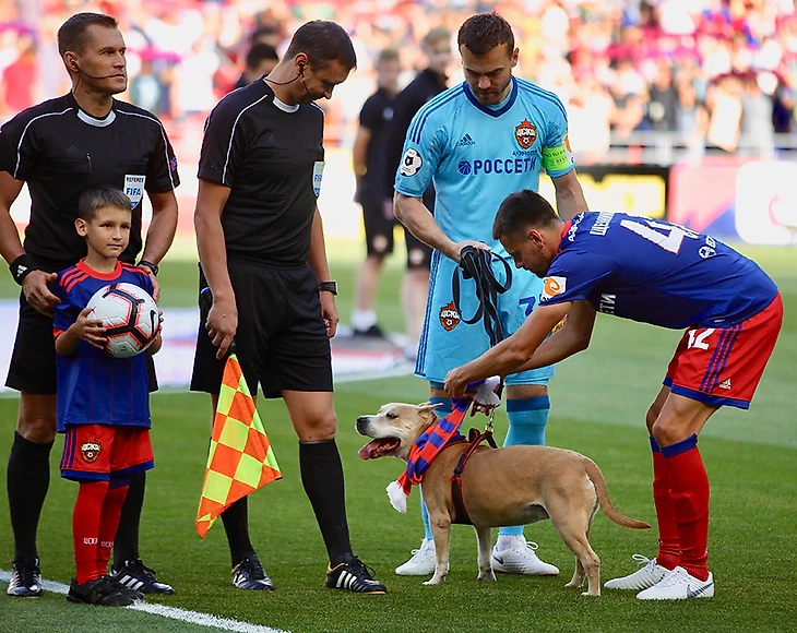 Сегодня что ни матч на «Песчанке», то новые активности и сюрпризы для зрителя. Вот и к игре с «Арсеналом» клубные службы подошли творчески, с выдумкой. Во Всемирный день защиты бездомных животных футболистов вместо привычной детворы на поле вывели… собаки. Армейскому капитану Игорю Акинфееву достался стаффордширский терьер Твен, его тульскому коллеге – жесткошерстный метис Дюкс. Твен и нанёс символический, первый удар по мячу – под присмотром уже профессионального дрессировщика.