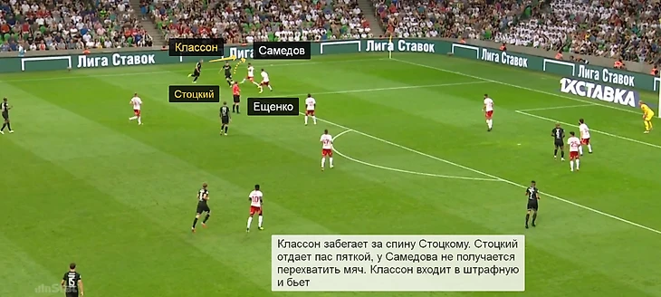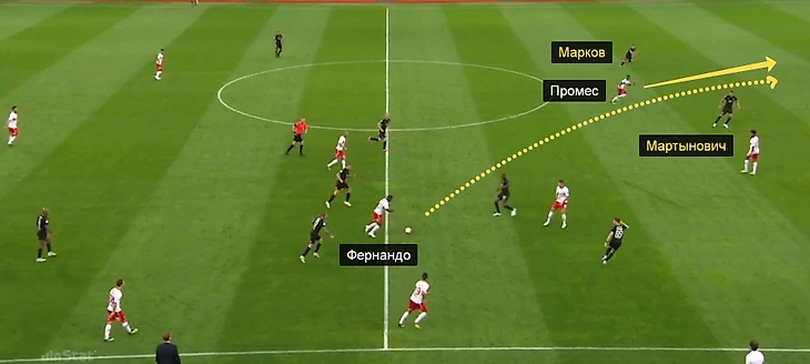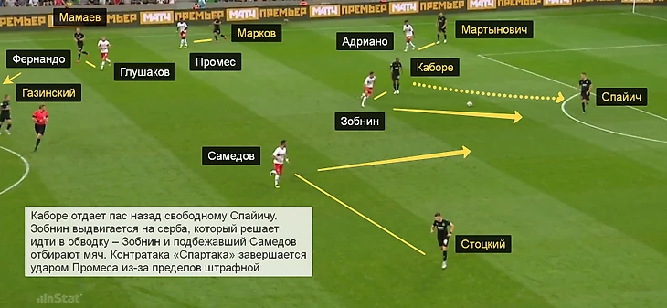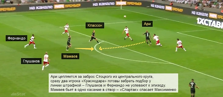 В этом матче у «Спартака» была только одна такая атака: Фернандо забросил на Промеса в зону между Мартыновичем и Марковым, но Крицюк успел помешать нападающему «Спартака».