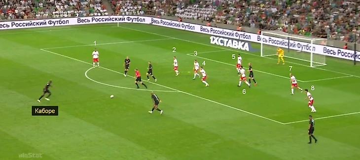 Удар Каборе в штангу пришел после атаки с другого фланга – Марков подключился в финальную треть и прострелил. Восемь игроков «Спартака» вжались в свою штрафную (Промес находился на фланге), поэтому Каборе пробивал без сопротивления.