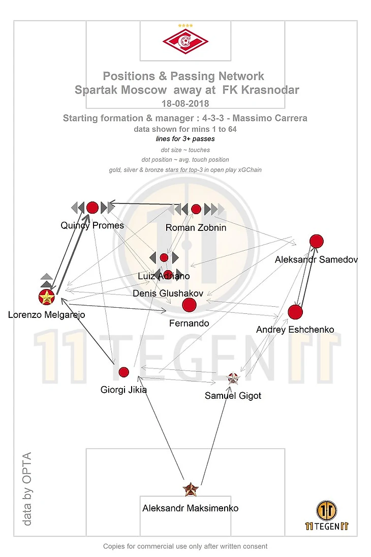 В позиционной обороне по Фернандо чаще всего продолжал играть Мамаев, и «Спартак» практически не имел возможность продвинуться вперед через центр поля. Каррера перестроился на фланговый переход из обороны в атаку и максимально сузил треугольник центральных полузащитников - на карте средних позиций Глушаков, Зобнин и Фернандо располагаются практически в одной точке.