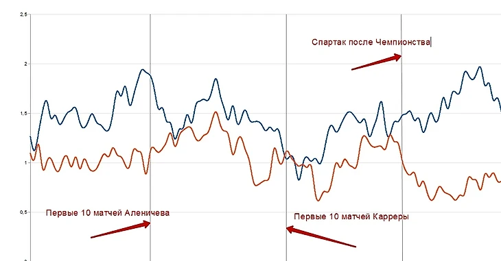 Интереснее, что было после него. А вот после чемпионского сезона, Спартак реально хорош. Продолжает расти синяя, моментов создается еще больше, налажена игра в обороне, команда в тот промежуток времени выглядела очень сбалансированной. Но провалена концовка сезона и сейчас на графике мы видим тревожную для поклонников "красно-белых" зарождающуюся тенденции сближения линий. Что это? Кризис или стечение обстоятельств? Высказывайтесь в комментариях...