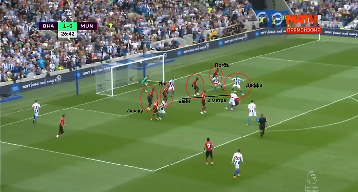 Мне почему-то запомнилась одна атака «Юнайтед», которая была разыграна почти идеально (второй скрин): Мата протащил мяч по правому флангу после передачи Фреда из центра, Лукаку увел центрального защитника из центра, а Марсиаль остался в изоляции на левом фланге. В результате образовалась хорошая зона между горизонтальными и вертикальными линиями «Брайтона», куда мог бы ворваться Погба – но он понял это слишком поздно, когда Мата уже вынужден был развернуться и отпасовать на Фреда. Бразилец, в теории, мог бы перевести мяч на левый фланг, но Марсиаль уже срезал в центр, а Шоу не подключился выше. Мяч был потерян, но атаку подготовили хорошо.