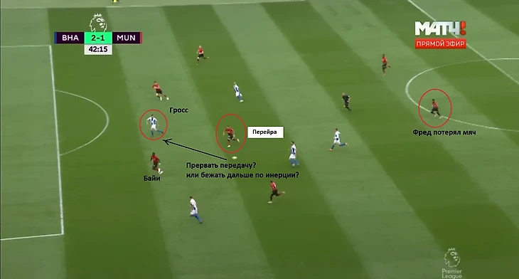 Во-первых, похвалю за билд-ап. В первом матче против «Лестера» начало атак МЮ выглядело либо как 3-2 (два ЦЗ и Перейра + Фред и Погба довольно глубоко, выше в центре – никого), из-за чего продвигать мяч во вторую/финальную треть получалось со скрипом, либо 3-0 (Погба и Фред одновременно очень высоко), из-за чего мяч не двигался вообще. Фланговые защитники тоже находились очень высоко и не могли помочь «Юнайтед» выйти из обороны. Против «Брайтона» в первом тайме билд-ап выглядел как 3-1, причем эта единичка варьировалась: то Фред, то Погба. Нападающие «Брайтона» изначально в прессинге закрывали собой полузащитников (Перейру и Погба/Фреда); когда игрок МЮ пасовал назад, они выбрасывались прессинговать защитников. Тогда опускался Перейра, создавая преимущество 3-в-2, а Погба или Фред опускались на помощь. На реакцию у Стивенса/Проппера (ЦП «Брайтона») уходило время, и его хватало, чтобы МЮ вышел из-под прессинга (плюс в центральной зоне «Брайтона» создавалось пространство). Вариант с дальнейшим пасом тоже был – второй полузащитник ведь все еще в центре. Более того, в оставленное пивотами «Брайтона» пространство в центре мог войти Мата. Типичная ситуация – на первом скрине.