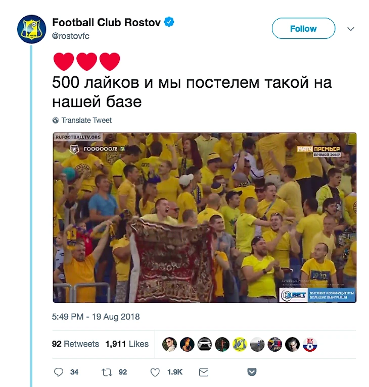Правда, когда «Ростов» присел на вирусную волну, не обошлось без неловкого момента: официальный твиттер клуба опубликовал скриншот из пиратской трансляции, и тут в переписку ворвался аккаунт канала «Матч Премьер». Перестрелка закончилась обещанием подарить код на годовую подписку за 500 лайков к очередному твиту (видимо, не получится – пока всего 101 сердечко).