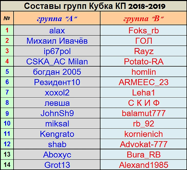 1 этап (групповой) - 28 команд делятся на 2 группы (группа "А" и группа "В") по 14 команд... деление произошло согласно текущей таблицы лиги (после 3-х туров) - "на первый-второй рассчитайсь!") ...
