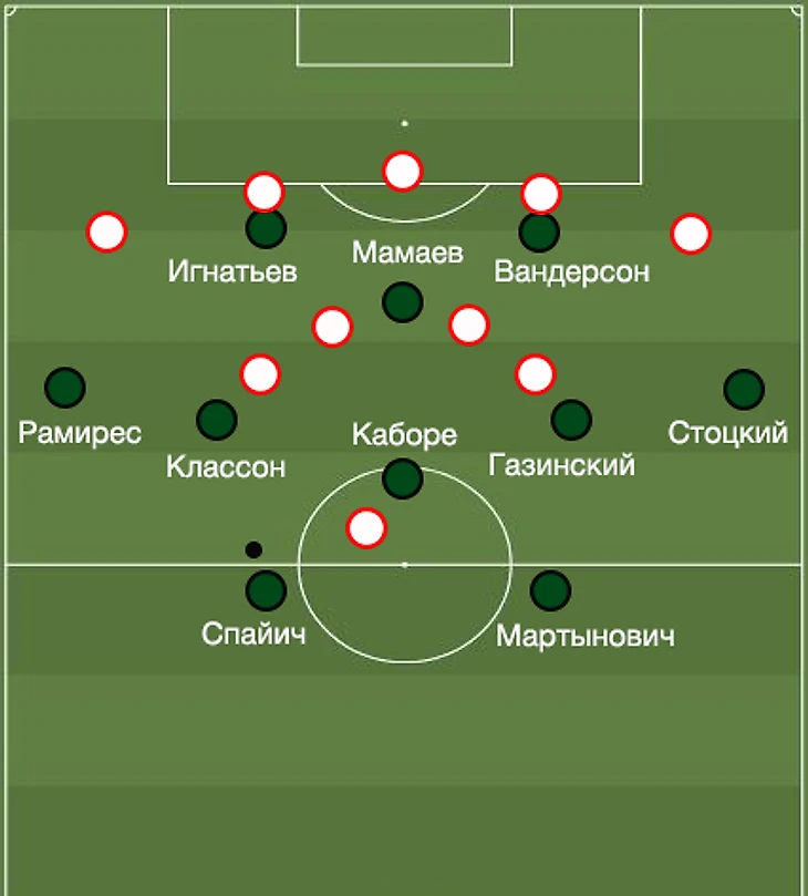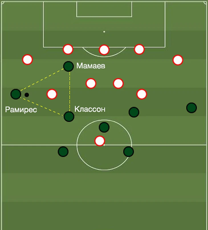 Мамаев продолжит играть вместо Перейры. На позиции «десятки» он так же должен сканировать полуфланги на предмет свободных зон и формирования треугольников с Рамиресом и Классоном.
