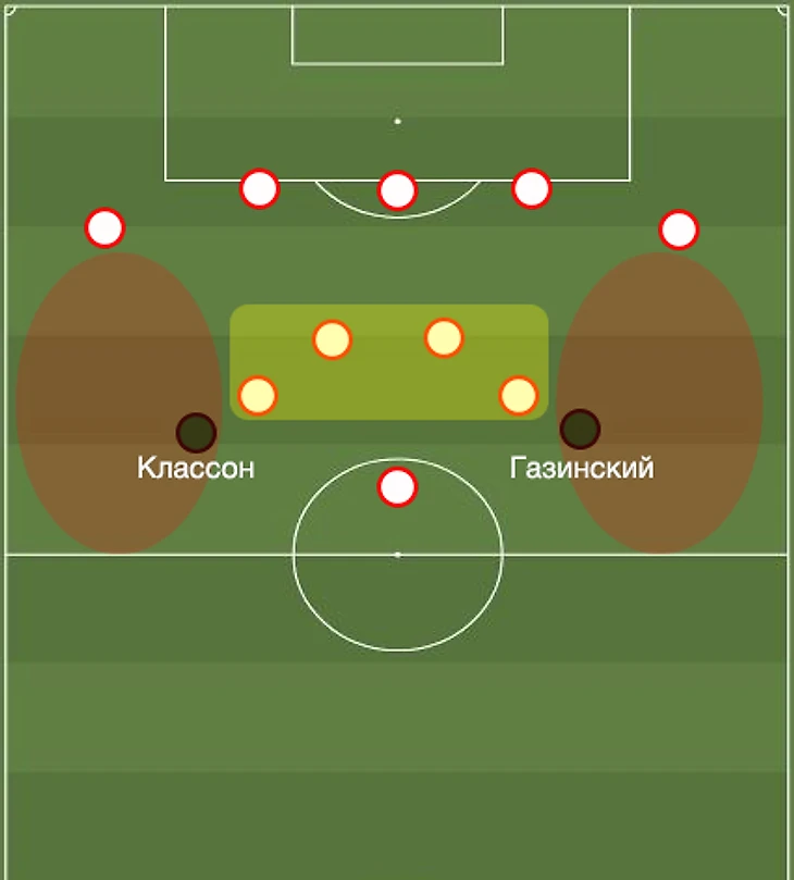 Эти зоны необходимо использовать. Пусть Классон и Газинский займут более широкие позиции. Тем более в предыдущих матчах мы их частенько видели в этих зонах.