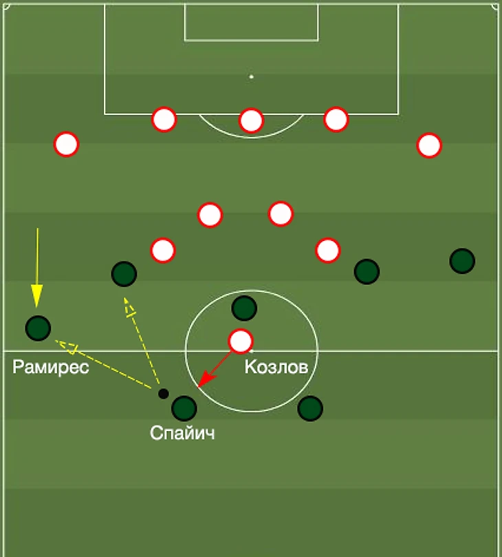 Единственный нападающий «Оренбурга» Козлов предположительно будет работать в ситуационном прессинге по Спайичу. К сожалению, серб в предыдущих матчах дал для этого повод, теряясь под давлением (особенно Зобнина). Учитывая такие риски, Рамирес должен располагаться чуть ниже и помогать Спайичу в билдапе.