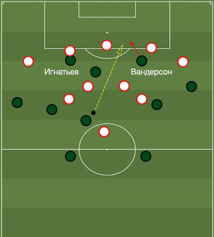 Очевидно, что против тройки центральных защитников одинокий нападающий может затеряться. За примером долго ходить не надо. Смолов в дебютной игре за «Локомотив». В пару к Игнатьеву отправим скоростного Вандерсона, способного одним движением открепиться от защитников и принять проникающий пас у них за спинами.