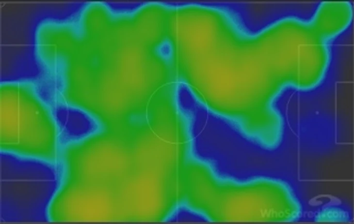 7. Динамо не ставило автобус но и не так организованно владело мячом и прессинговало как Краснодар, поэтому показалось, что Промес обретает себя прежнего. Но он и был таким вначале сезона, просто, наконец-то, соперник предоставлял пространство, которого так не хватало Квинси ранее(например, в матче с Анжи). И вот сразу появились обводки, удары, смещения в центр и острые передачи. Его связка с Мельгарехо, как по мне, намного перспективнее и интереснее, чем с Комбаровым, тем более вчера парагваец показал, что как минимум не хуже россиянина играет в отборе. На тепловой карте отчетливо видно, насколько чаще и разнообразнее Спартак атаковал через свой левый фланг. В цифрах это 45% атак против 28% через правый.