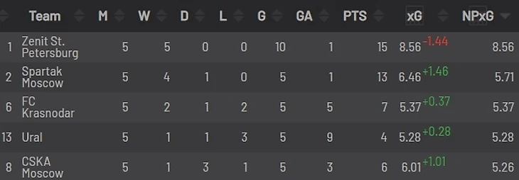 2.Создаваемые с игры моменты. В прошлом посте про лучших атакующих игроков России прошлого сезона я уже рассказывал про такой стат, как NPxG- созданный xG за исключением ударов с пенальти.Сейчас ЦСКА на 5 месте в Лиге по этому показателю, но там очень близкие результаты со 2-е по 5-е место. Пока у армейцев этот показатель 5,21 за 5 матчей, т.е 1,052 за игру. У идущего на втором месте по этому показателю Спартака- 5,71, что совсем рядом. В прошлом сезоне красно-синие были третьими по этому стату с показателем 1.347 за игру.